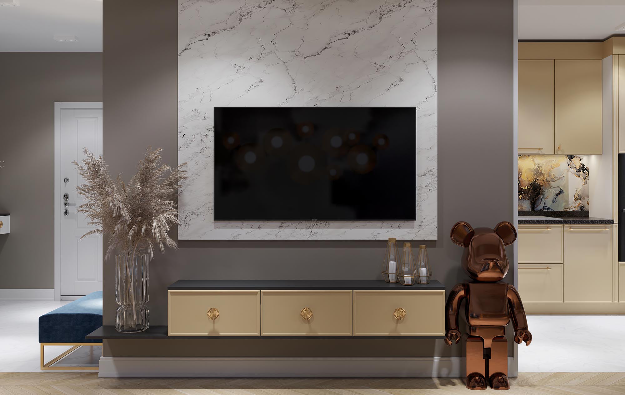 Эта гостиная — воплощение современного дизайна с акцентами классической изысканности. Подвесная тумба с золотыми ручками и фасадами в тонкой рамке добавляет интерьеру лёгкости, изысканности и безупречного вкуса.